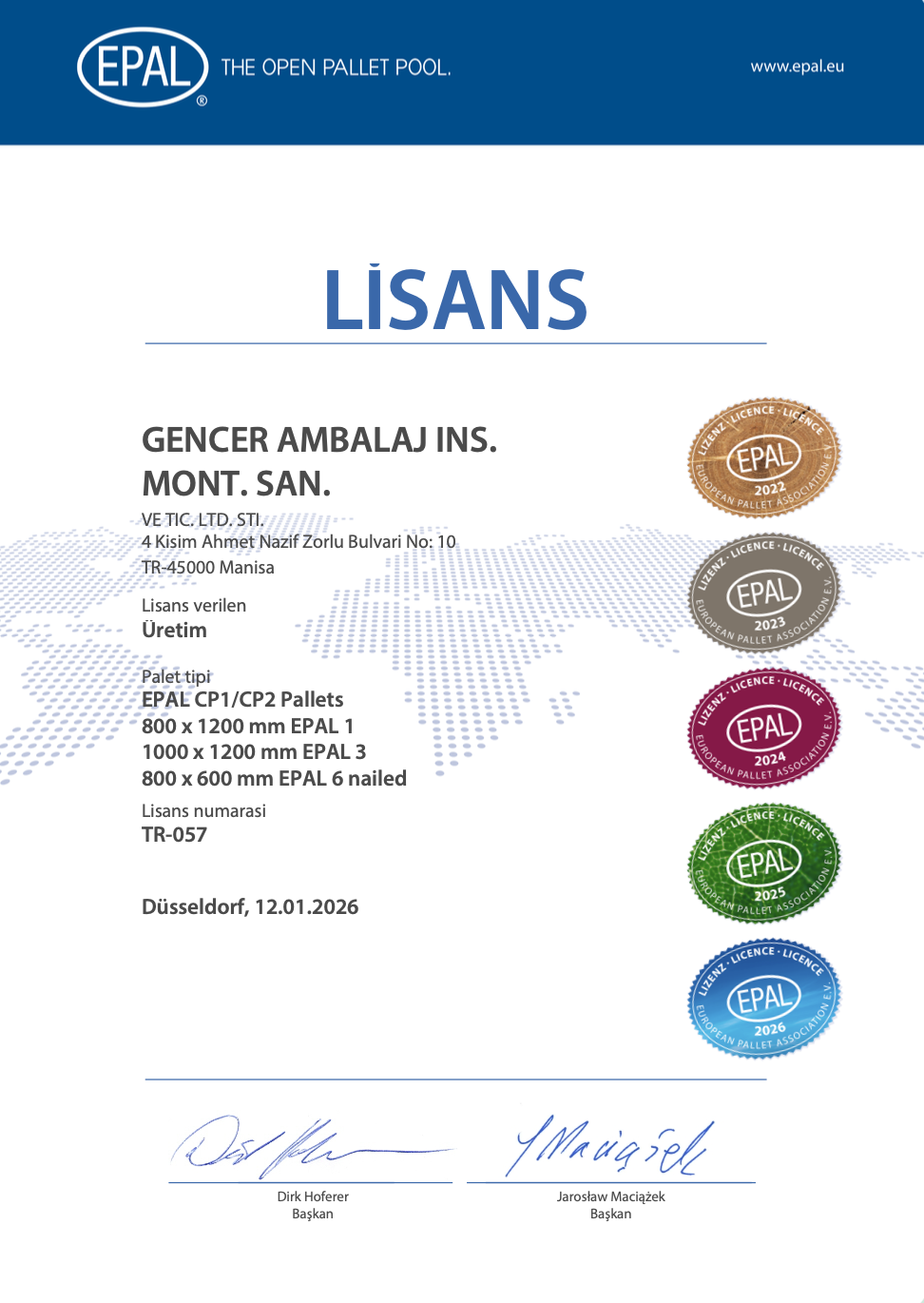 Gencer Ambalaj, TR-057 lisans numarası ile EPAL Üretici Lisansı 'na sahiptir.